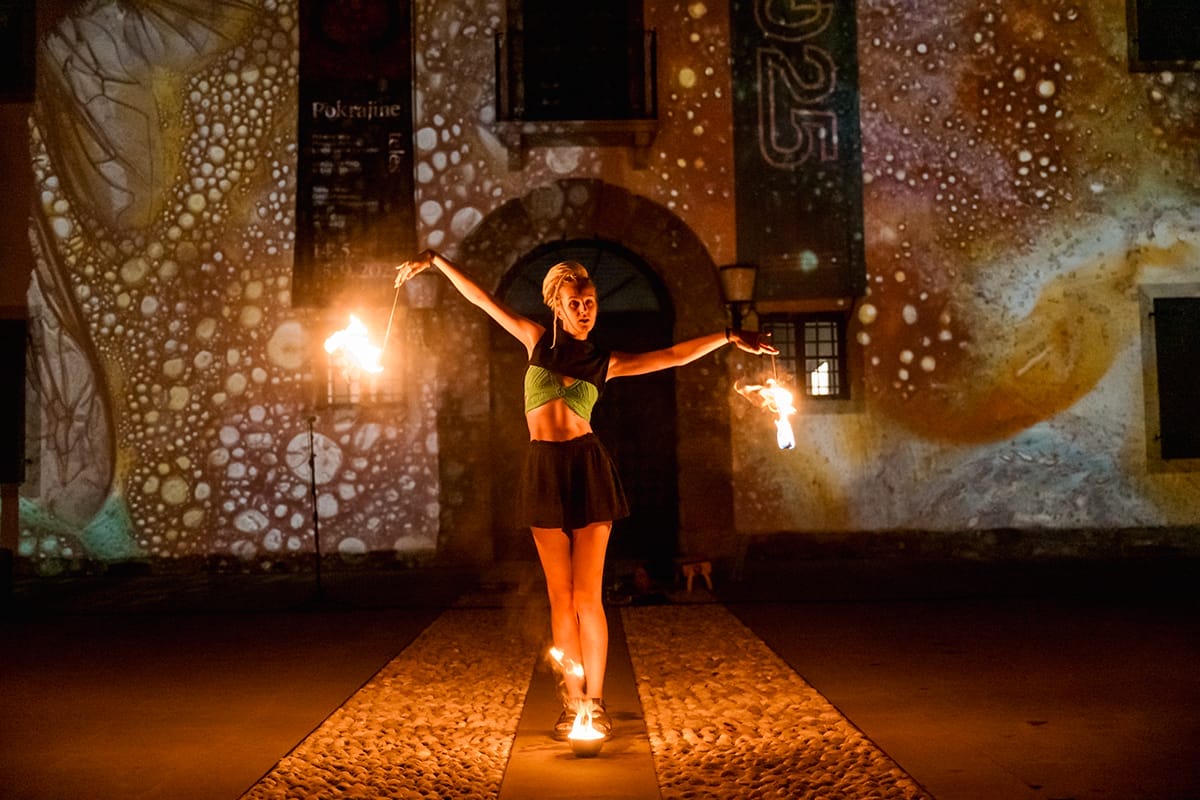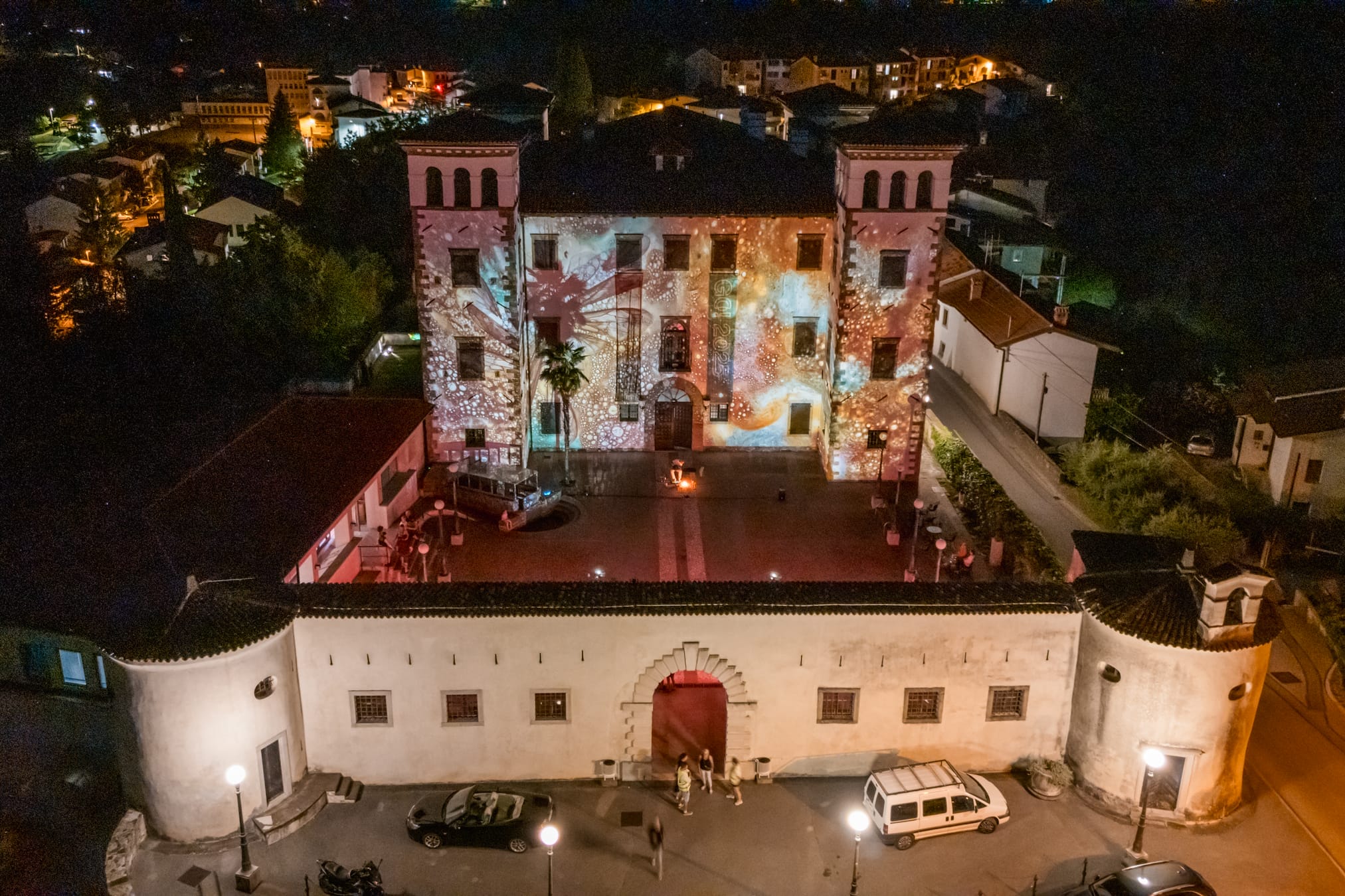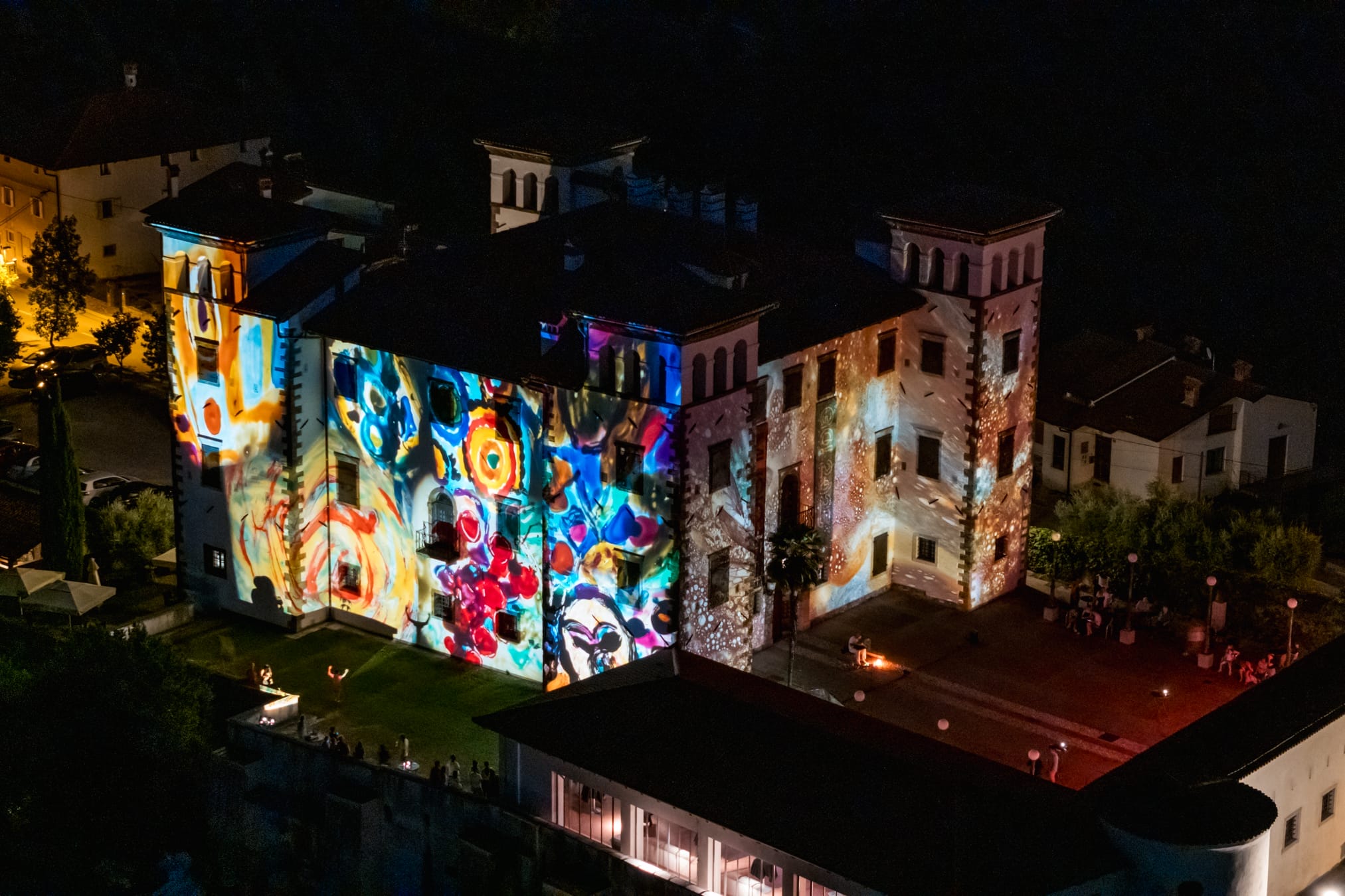 The focus of LuMenArtist is light as a natural resource and as an artistic tool. These two dimensions come together in visual events, combining the power and brilliance of contemporary instruments and the sensitive, almost artisanal eloquence of hand drawings. However, it seems that the specific nature of glass serves as the lowest interpretative common denominator of the spectacle at Dobrovo Castle, at least in formal terms. It appears that LuMenArtist played out their fascination with glass and its almost mystical bond with light on different sections of the castle walls. While this fascination may date back centuries, it seems to take on a new expressive power in LuMenArtist’s project. The delicate, bubbly structures of warm, pastel colors, which clung to the castle walls with nonchalant organicity, were reminiscent of light refracted through stained glass, where close magnification reveals the imperfections of the production process, the air bubbles trapped in the glass material create a texture and evoke special dynamism, illustrating the tension between different states of matter. And yet, the evocative power of the light projections in Dobrovo reached much further than that. The narrative of their fluid surfaces was also reminiscent of a strip of celluloid film undergoing a transformation: like when film directors in thrillers illustrate the destruction of some film evidence as it burns up due to overheating, bubbling as it dissolves, telegraphing a change of the state of matter.