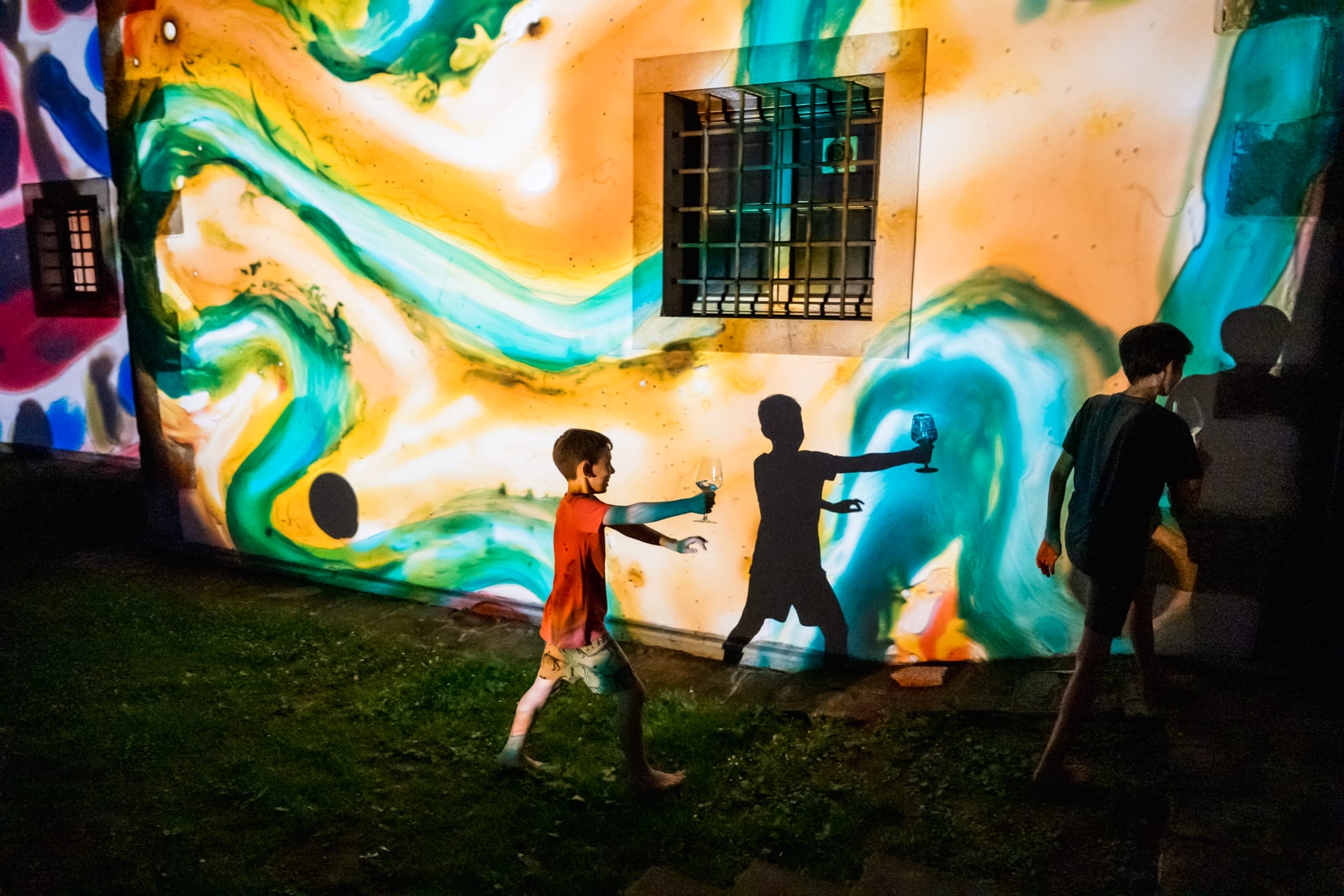 It seems to me that these two elements, the narrative and the transformation, are essential to understanding the work of LuMenArtist. The abstract nature of their material offers a bounty of suggestiveness, leaving the imagination free to create all kinds of stories from the dynamic light compositions. On the other hand, the experiences they create are highly transformative. This is true even at the level of abstract motifs, which remain in a constant state of change and transition. Here, abstraction and fluidity go hand in hand, as we follow changes in their projections that can also be interpreted in the language of painting theory, from Knifer's meanders to blistering op art surfaces, colorful spectacles featuring hypnotic swirls, Pollock-esque saturated compositions, soft transitions from the geometric to the organic, which seems to be much closer to the duo. However, the transformativity that their work aims at, judging by the event in Dobrovo, goes beyond the visual, it is a synaesthetic experience that aims to achieve spiritual transformation through an enriched phenomenology of the surrounding world. It is therefore not surprising that certain projections, especially those on the left side of the castle, so strongly evoked Gothic stained glass formations, with colorful rosettes, roundels, elongated floral designs and even a few witty medieval vignettes. The metaphysics of light was at the core of the fascination with the great church windows of the late Middle Ages, in which this very metaphor becomes the path to ascension of humankind. The LuMenArtist duo makes abundant use of the transformative power of light in similar, yet much more immanent experiences associated with the mundane world, in which abstract luminous metamorphoses enrich our emotional-perceptual world to the point where the experience begins to change us from within.